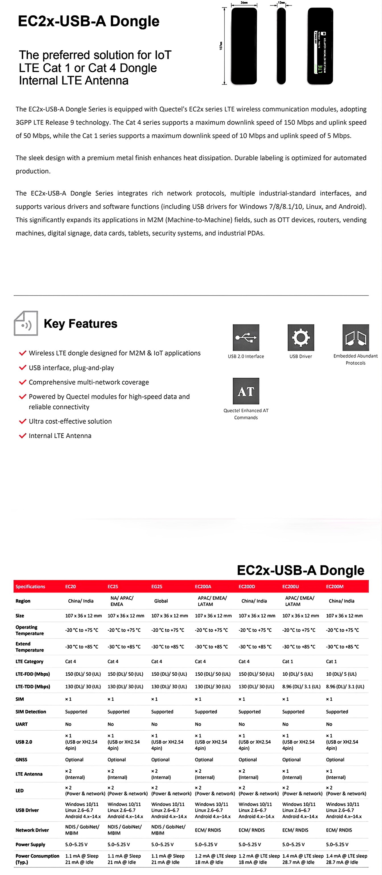 The EC2x-USB-A Dongle Series integrates rich network protocols, multiple industrial-standard interfaces, and supports various drivers and software functions (including USB drivers for Windows 7/8/8.1/10, Linux, and Android). This significantly expands its applications in M2M (Machine-to-Machine) fields, such as OTT devices, routers, vending machines, digital signage, data cards, tablets, security systems, and industrial PDAs.
