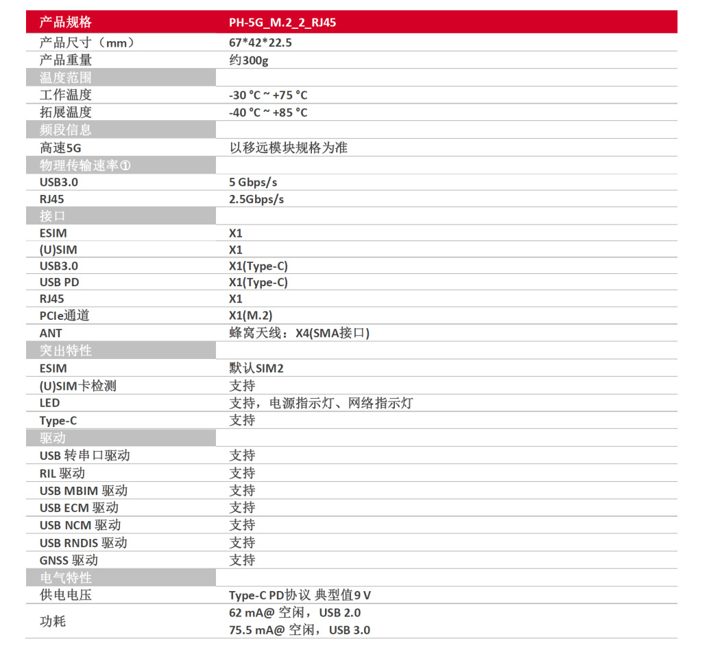 PH-5G_M.2/RJ45 is designed to use a compact Type-C PD protocol for power supply, with default support for eSIM (SIM2) and external antenna support. It is compact in size, easy to carry, plug and play, and solves the problem of outdoor lack of network and complex operation to the greatest extent possible. In IoT applications, it supports connecting 4 external cellular antennas and using multiple receiving antennas to receive signals, thereby reducing bit error rates and improving communication quality. The overall shell adopts CNC technology, which is solid and durable.
